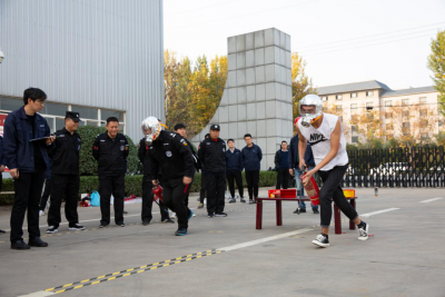 保衛(wèi)部微型消防站隊(duì)員需完成原地著消防防護(hù)服、佩戴自救呼吸器30米滅火、一人兩盤(pán)水帶連接操。原地著防護(hù)服,隊(duì)員在聽(tīng)到“開(kāi)始”口令后迅速穿戴防護(hù)服、消防靴、消防頭盔、扎安全腰帶。佩戴自救呼吸器,在起點(diǎn)處完成空氣呼吸器的佩戴,隨即提起4kg干粉滅火器快速到達(dá)距離30米處的指定區(qū)域進(jìn)行滅火。一人兩盤(pán)水帶連接操,隊(duì)員迅速甩開(kāi)***盤(pán)水帶,一端接到消火栓接口,另一端接到第二盤(pán)水帶,在行進(jìn)中接上水槍到達(dá)終點(diǎn),完成比賽。